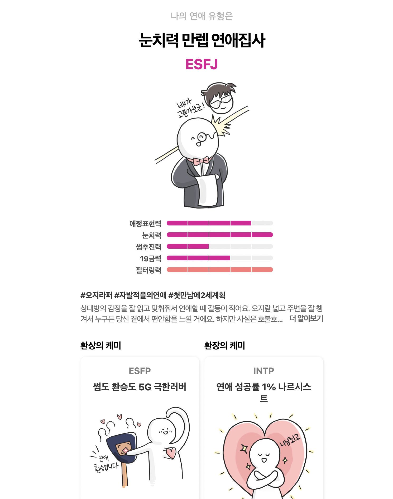 결과는 ESFJ가 나왔다. 나는 평소에 INFJ인데 오히려 설명 읽어보니까 이게 더 맞는 것 같아서 너무 소름 돋는 연애 심리 테스트라고 생각했다.