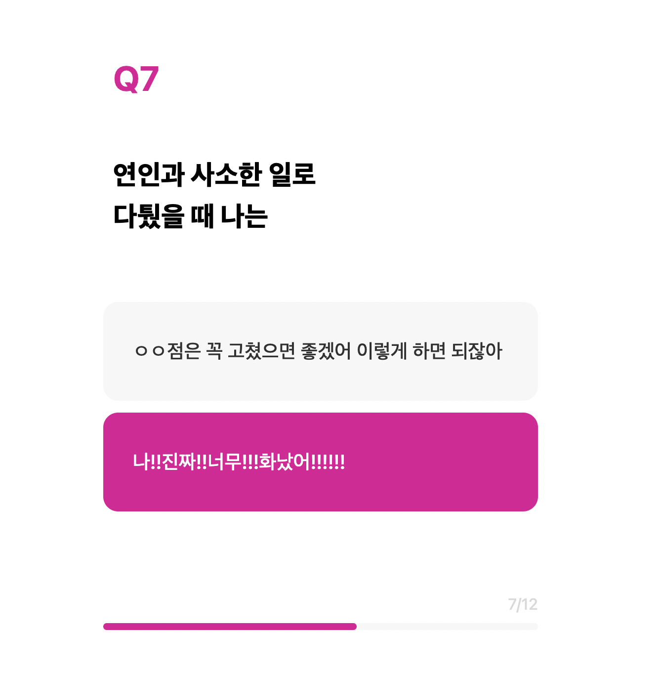 나는 완전 감정적인 사람이라 질문 보자마자 나 진짜 화남을 골랐다. 서운한 상황에서 ~점을 꼭 고쳐줘.라고 일목요연하게 말하지 못하는 편이다..